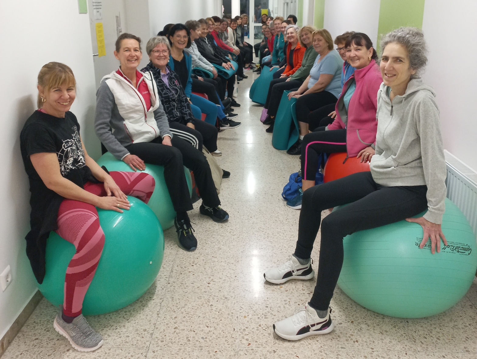 Bei der beliebten Bewegungseinheit für Damen am Montag werden unterschiedliche Übungen für die Ausdauer und zur Kräftigung der gesamten Muskulatur durchgeführt. In den Wintermonaten sind davor die Fußballer in der Turnhalle. Die Damen warten (un)geduldig am Gang, dass sie dann gemeinsam die Turnhalle stürmen dürfen.